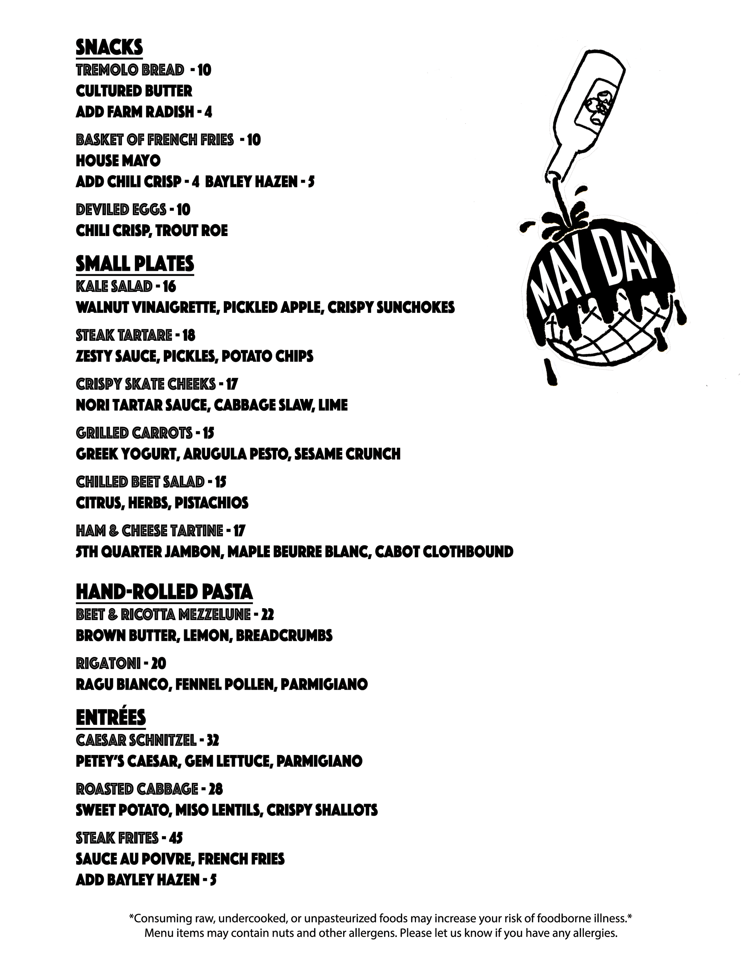 MAY DAY IS A BURLINGTON RESTAURANT LOCATED IN VERMONT’S OLD NORTH END NEIGHBORHOOD. YOU WILL BE WELCOMED WITH WARM HOSPITALITY, SEASONALLY INSPIRED FOOD AND A STUNNING COLLECTION OF NATURAL WINES AND CRAFT COCKTAILS. WE ARE OPEN 7 NIGHTS A WEEK AND HAVE SPACE AVAILABLE FOR WALK-IN AND OFFER A PORTION OF OUR DINING ROOM FOR RESERVATION.